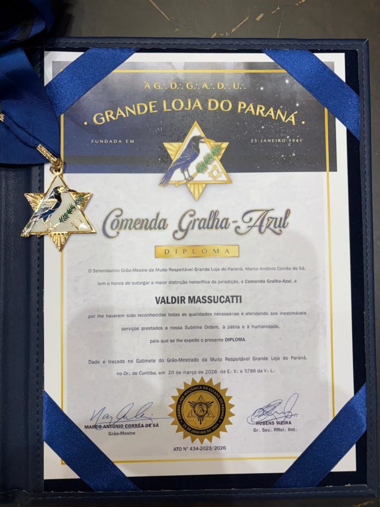 O Sereníssimo Grão-Mestre Valdir Massucatti recebeu, em Curitiba, o diploma e a comenda Gralha-Azul, a mais alta distinção honorífica da Grande Loja do Paraná.
